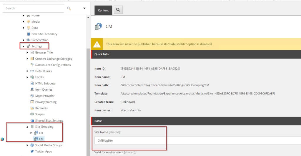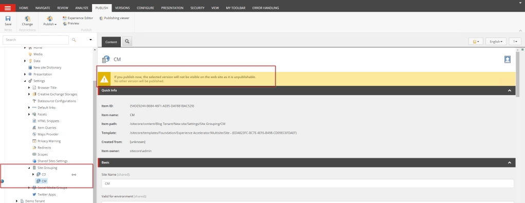 What we usually do, we create two site definitions – one for CD and one for CM. The one for CD is also publishable. The one for CM is not: