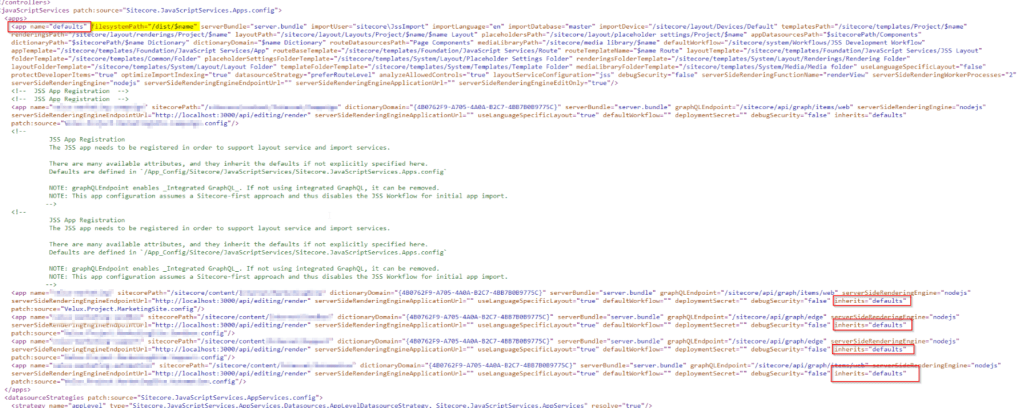 You just need to add this attribute filesystemPath=”dist/{default-app-name}” e.g. filesystemPath=”dist/mastersite” to every single app definition under javascriptServices app config node which will override default “dist/$name“:
